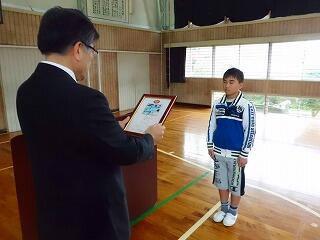 そこで、本日、当協議会より、宮崎地方法務局日南市局長の山崎 司 様、人権擁護委員串間地区担当の久保野 俊郎 様、法務局日南支局長補佐の川畑 清美 様、市木地区人権擁護委員の田代 保則 様、串間事務局員の5名が来校され、授賞式を行いました。