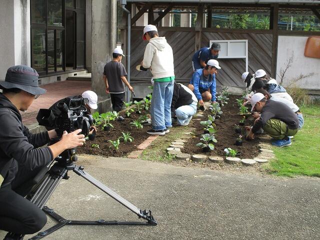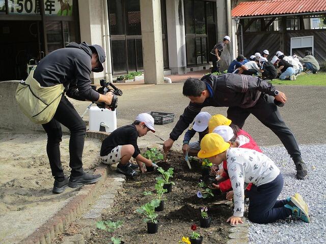 11月19日(水)3校時、全校児童で花植え活動をしました。同時に、UMKの方が来校され、宮崎県民共済のCM撮影が行われました。本校に「みどりの少年団」が設立されて、今年が50年目になります。花壇への花植え活動、地域に配付するプランターでの花の育成等、さまざまな緑化活動に取り組んでいる様子の一端を撮影していただきました。