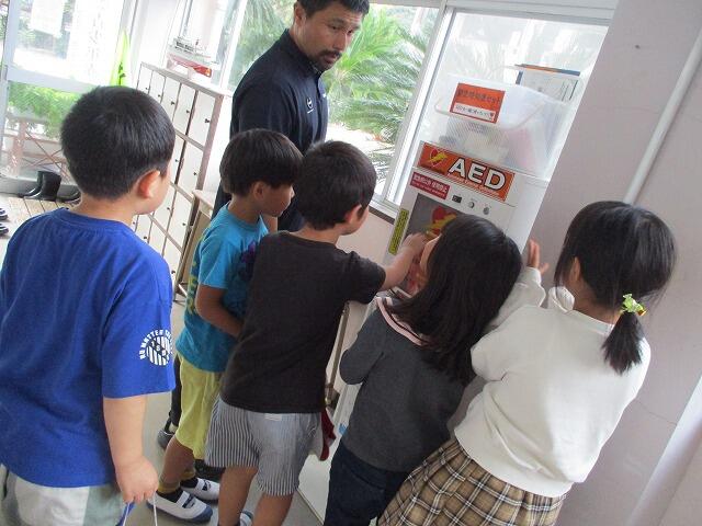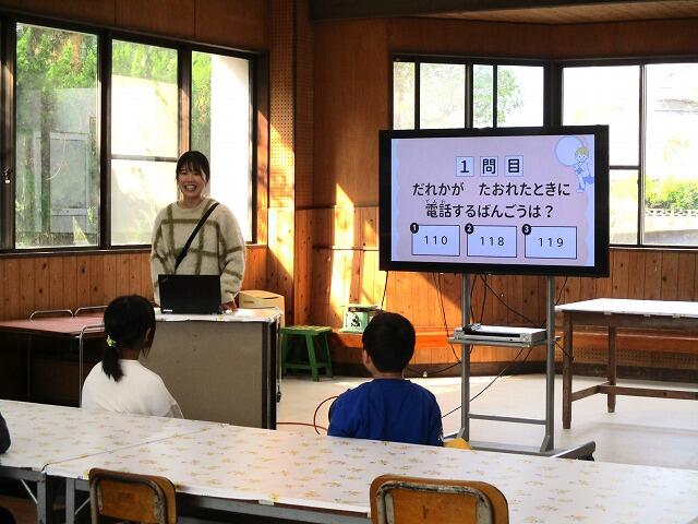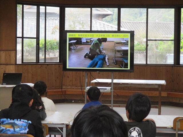 11月25日(火)全校集会で、緊急時の対応について、児童自らどんな行動を取ればよいか考える時間を設けました。傷病者発生時に周囲に大人がいない場合を想定して、何をすればよいか児童だけで考え、その後動画を視聴しました。「大人を呼ぶこと」「AEDの場所」「緊急時の電話」等、プレゼンでのクイズ・説明で、大事なポイントを確認しました。