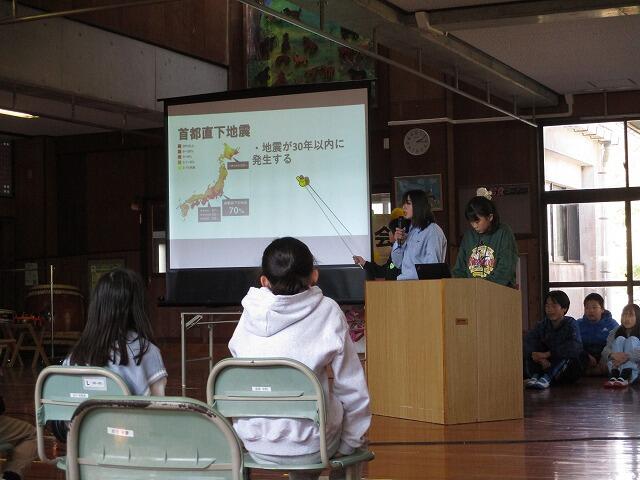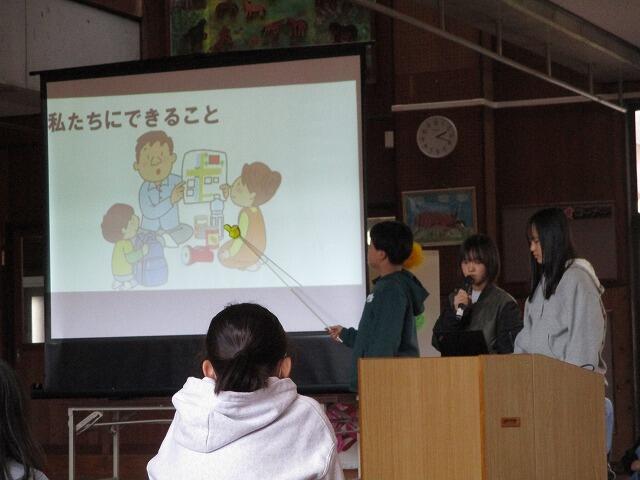 1月15日(木)午前中に、福島高校からのお誘いを受けて、高校生と一緒に全校児童が津波からの避難訓練を行いました。「逃げトレ」というアプリを使って自分たちで考えて避難をする学習活動でした。九州大学の杉山高志准教授から都井小学校ホールにて高校生と一緒にアプリの操作方法の説明を受けました。バスで都井漁港に移動し、3か所に分かれて避難を開始しました。どこに向かって避難していくのか相談しながらの活動でした。杉山高志准教授から「津波を知ろう 地域を知ろう」をテーマに取り組み、『正しく恐れる』ことが大切であることを教えていただきました。海岸の近くにある学校として、今回の訓練はたいへん学びの多い学習になりました。