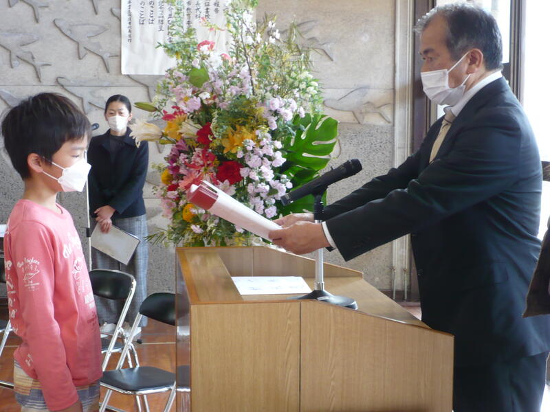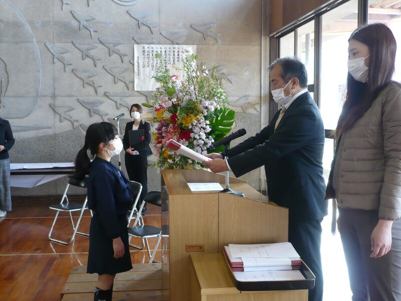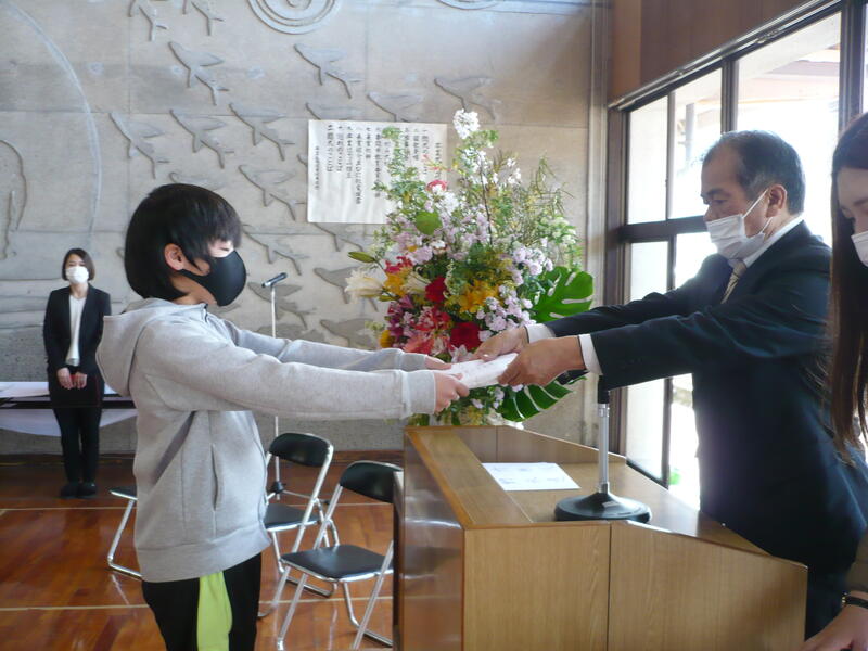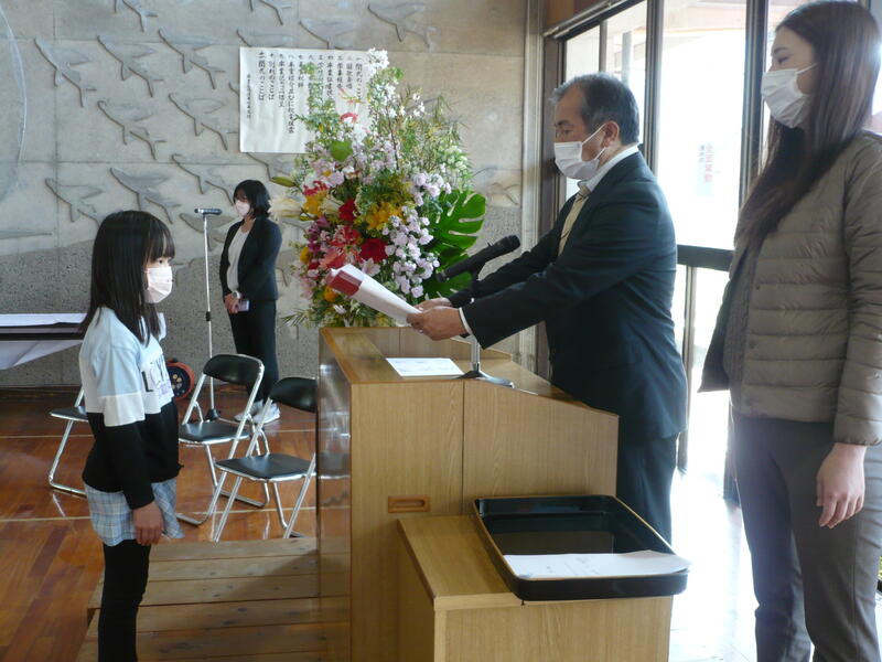 令和3年度の修了式がありました。校長先生から、子どもたちの代表が学年の修了証を受け取りました。また、今年1年を振り返り、来年に向けて頑張りたいことの発表も行いました。