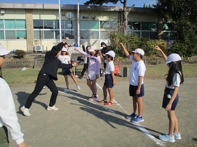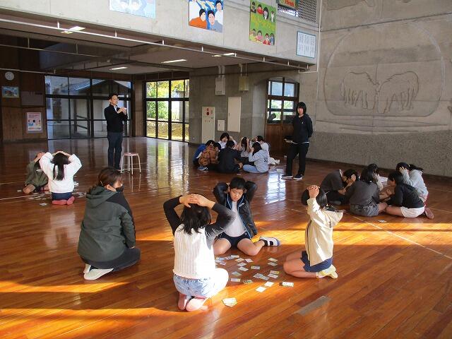 10月17日(木)1~4・6年生は電車で日南市に出かけ、体験活動を計画していたのですが、不安定な天気のため校内遠足に変更いたしました。6年生や先生方が協力して、体育館での遊びや校内ウォークラリーを企画して楽しく過ごすことができました。