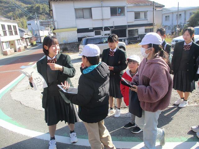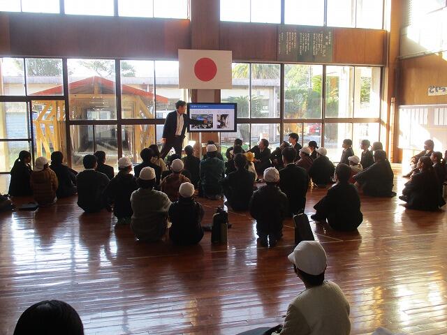 1月15日(木)午前中に、福島高校からのお誘いを受けて、高校生と一緒に全校児童が津波からの避難訓練を行いました。「逃げトレ」というアプリを使って自分たちで考えて避難をする学習活動でした。九州大学の杉山高志准教授から都井小学校ホールにて高校生と一緒にアプリの操作方法の説明を受けました。バスで都井漁港に移動し、3か所に分かれて避難を開始しました。どこに向かって避難していくのか相談しながらの活動でした。杉山高志准教授から「津波を知ろう 地域を知ろう」をテーマに取り組み、『正しく恐れる』ことが大切であることを教えていただきました。海岸の近くにある学校として、今回の訓練はたいへん学びの多い学習になりました。