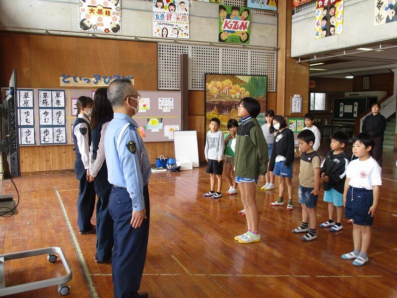 運動場では、旭消防設備の方から消火器の使い方について説明を受け、代表児童と職員が練習をしました。その後はランチルームで串間市消防本部の方から火災が起きたときの対応と注意点を教えていただきました。
