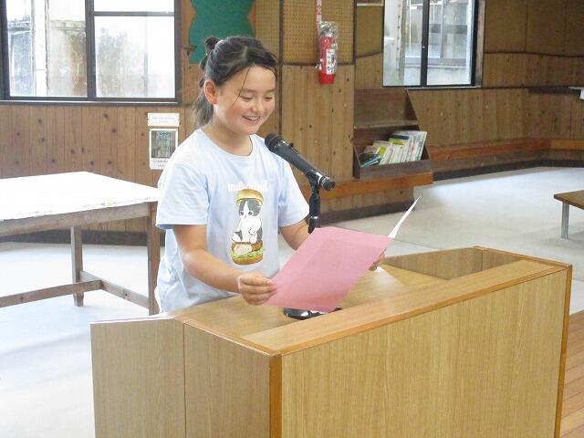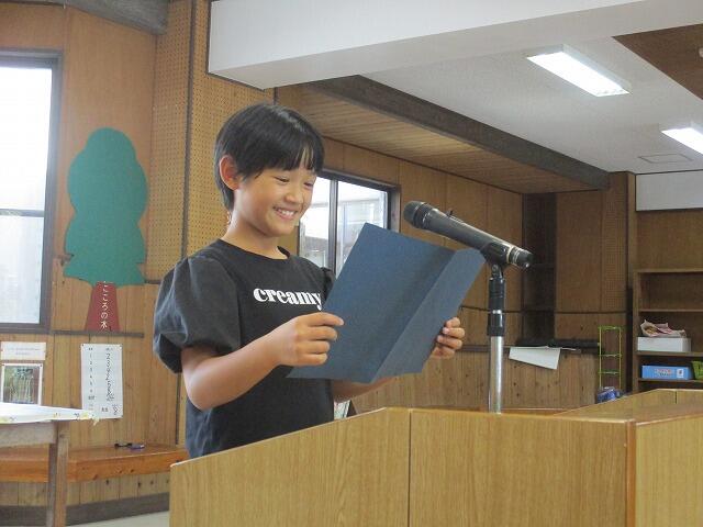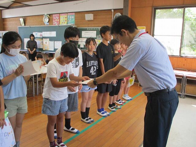 本日(7月18日)、1学期終業式を行いました。全校児童23名全員そろっての終業式で、代表児童が1学期の振り返りと2学期に頑張ることを堂々と発表しました。児童の発表を受けて、校長先生が今年度のキーワード「自分で決めて行動(自律力)」について、1学期に実践できていたことと2学期さらに自律力を高めるためのポイントを話しました。