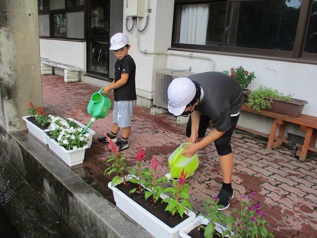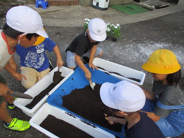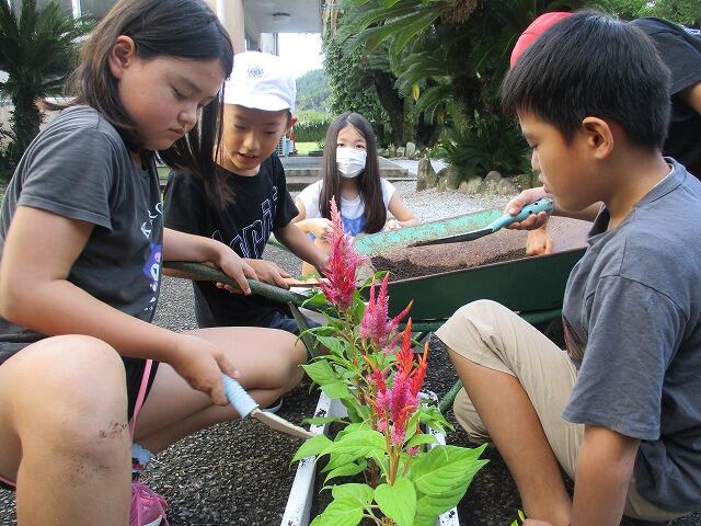 本校も大会に向けた機運醸成に協力させてもらい、9月12日(金)に全校児童で配布された花の苗をプランターに植えました。プランターにはシールを貼り、学年や名前等を書き入れました。これから水やりをして育てていきます。