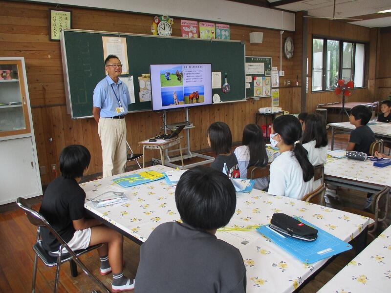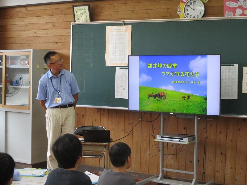 9月25日(木)3校時に、都井岬についての学習を行いました。講師として、串間市教育委員会生涯学習課の秋田優様に来校いただきました。「都井岬の四季 ウマが守る花たち」について、たくさんのスライドを提示していただき、説明の合間には秋田様が準備してくだった草花を手に取り、手触りを確認したりにおいをかいだりしました。都井岬の花に、絶滅危惧種や毒性があるものがあり、ウマとの関係も深く、ウマによる環境保全についても知ることができました。子どもたちが、地域にある「都井岬」を詳しく知り、貴重な場所であることを実感してほしいと願っています。次は、課題意識をもって、実際に都井岬に出かけます。
