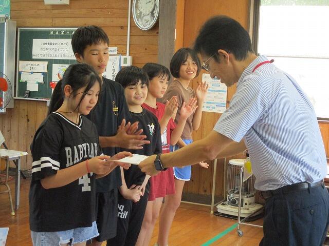 読書集会の後、夏休み中に健康に関する「ハッピービンゴカード」に頑張って取り組んだ皆さんを表彰しました。