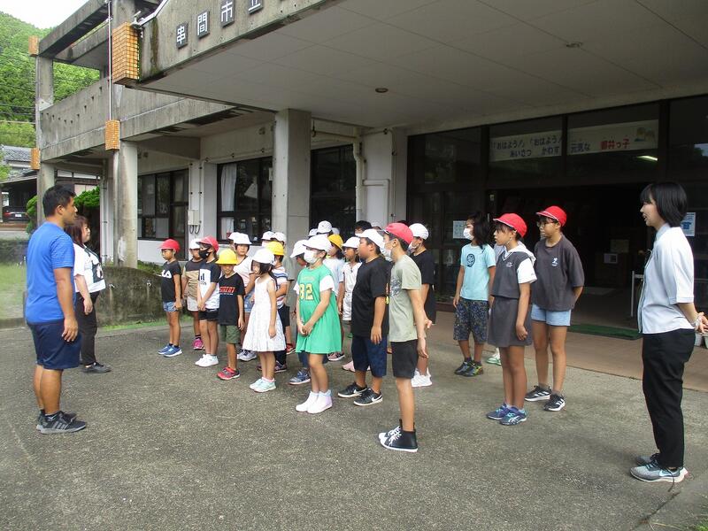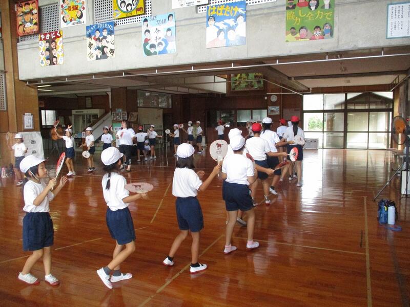 高学年のお兄さんお姉さんが1年生に全校ダンスを教えてくれていました。