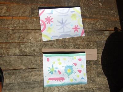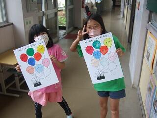 1年生は絵の具を使って絵を描きました。赤と青で紫をつくったり、赤と白で桃色をつくったりしていました。