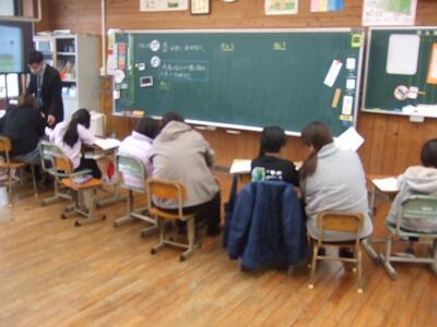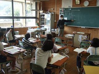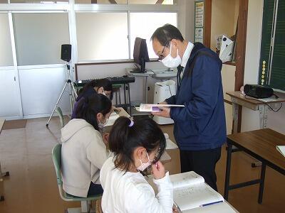 34年生は算数の授業。3年生は担任の金丸先生、4年生は教頭先生と勉強です。しっかりと聞いたり考えたりして頑張っていました。