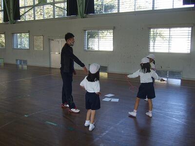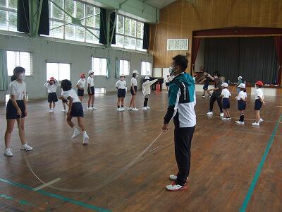今日も昨日に続いてあまり良い天気ではありません。運動場がぬれているため合同体育は体育館で行いました。みんなで縄跳びに挑戦しました。初めての長縄も一年生は上手に跳んでいました。みんなで連続跳びに挑戦していました。