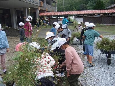 今朝はみんなで秋桜の片付け作業を行いました。子どもたちは、秋桜に「きれいなお花をありがとう」とお礼を言いながら片付けていました。