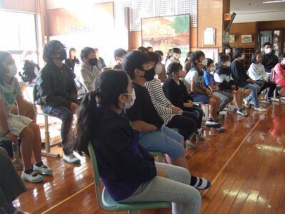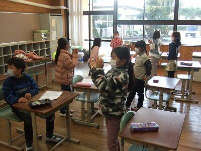 さて、今日の都井小学校。今日は朝の会の様子を撮りました。