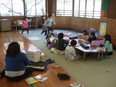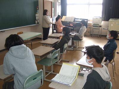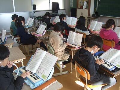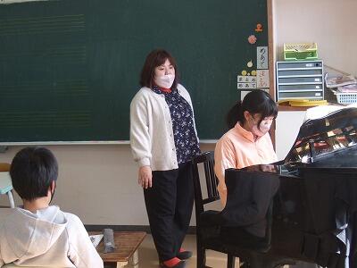 56年生は音楽。ピアノを弾く脇元さん、岩切さんもかなり慣れてたようです。歌に合わせて上手に弾いていました。