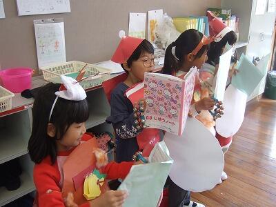 1・2年生は生活科で劇の発表練習。「かさこ地蔵」の一年生。可愛いですね。