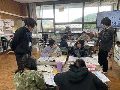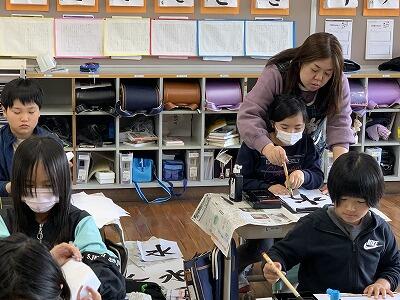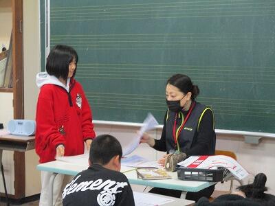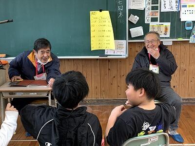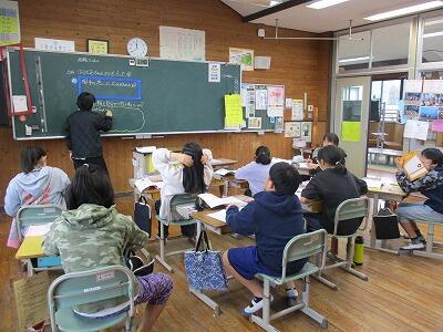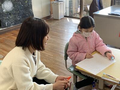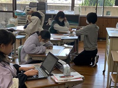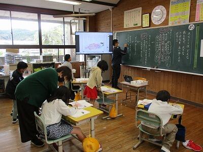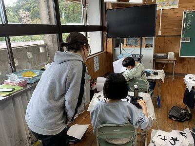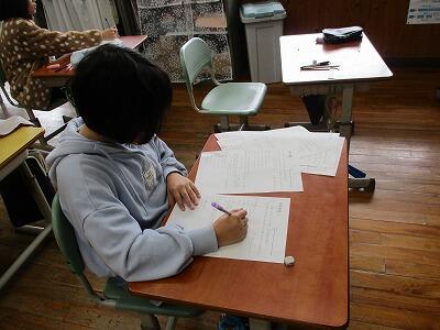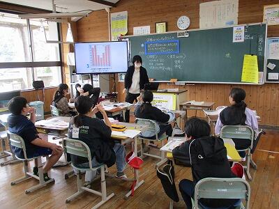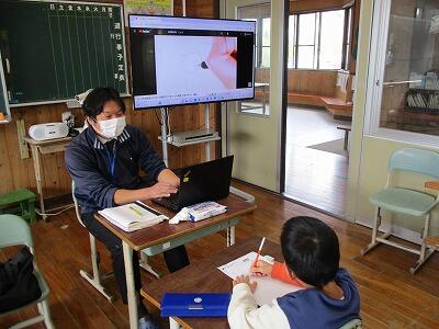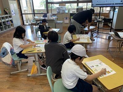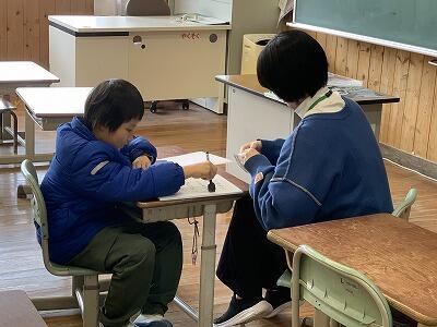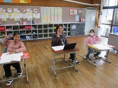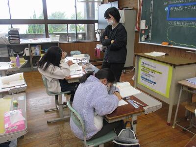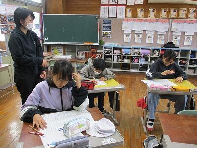 6年生です。担任の黒原先生と一緒に6年の学習の復習をしていました。