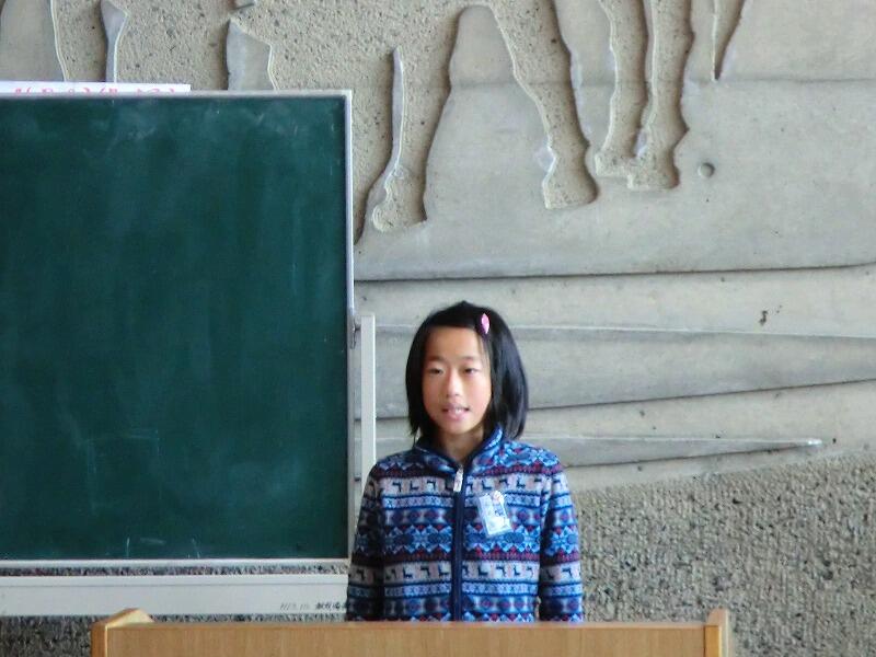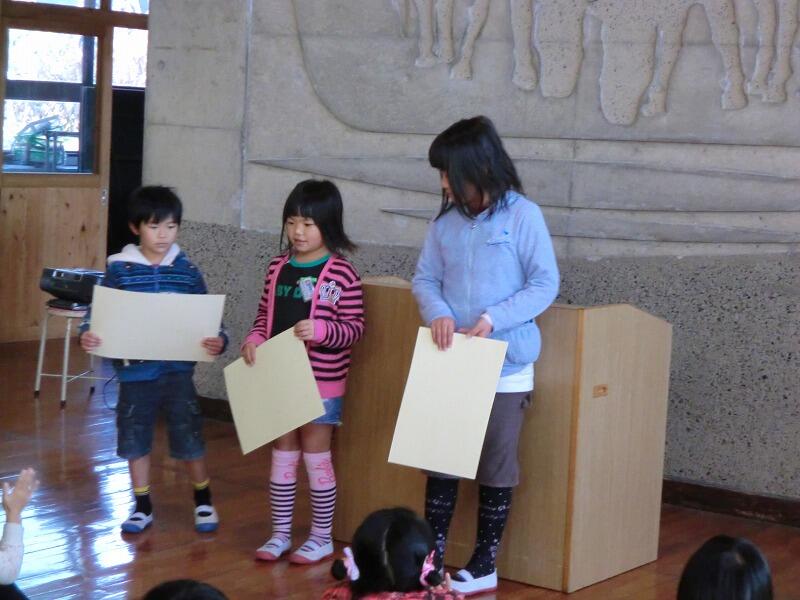 今日(2/4)は、全校朝会がありました。まず、校長先生の話。①最近の事件ふれ、知らない人について行かないこと②挨拶をしっかりしましょうの2つのことを中心にお話をされました。次に、長友先生から、月目標について。「外で元気よく遊ぼう」が毎日できたら、強い体を作ることができ、集中力も付き、健康な心にもつながるとの話。最後に表彰がありました。第45回宮日ジュニア展で優秀な成績をおさめた、なつみさん(4年)、優芽さん(2年)、光輝さん(1年生)が表彰されました。