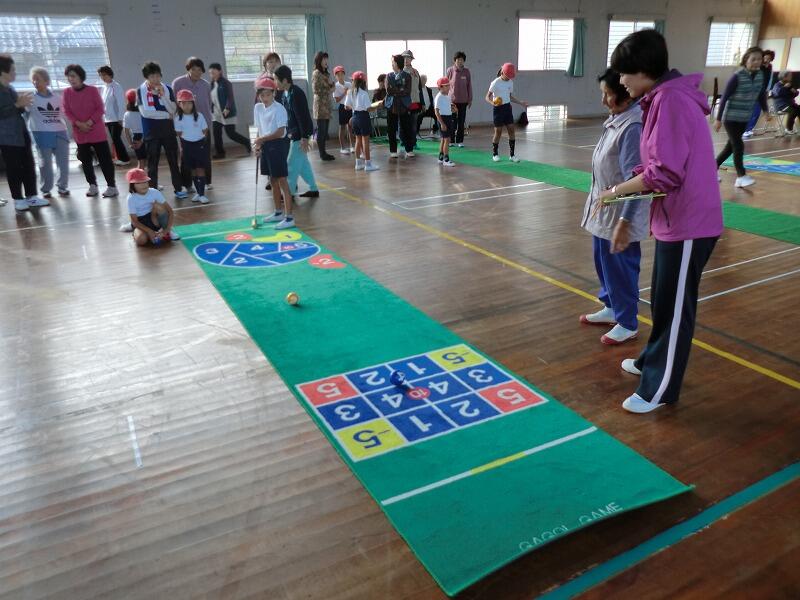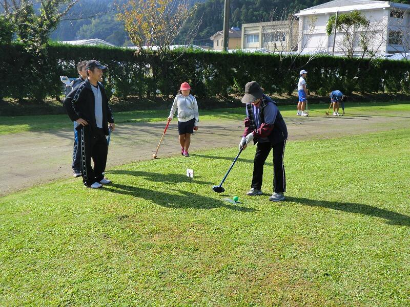 11月16日(土)は、毎年恒例の「都井地区異世代ふれあいスポーツ大会」がありました。地区の高齢者の方々と、1~4年生は「サロン競技」、5年~中3は「グラウンドゴルフ」を一緒に活動しました。昨年、一昨年と雨のため、運動場での「グラウンドゴルフ」は3年ぶりに行われたとか・・・。この行事で、さらに地域の高齢者の方々とお近づきになれました。
