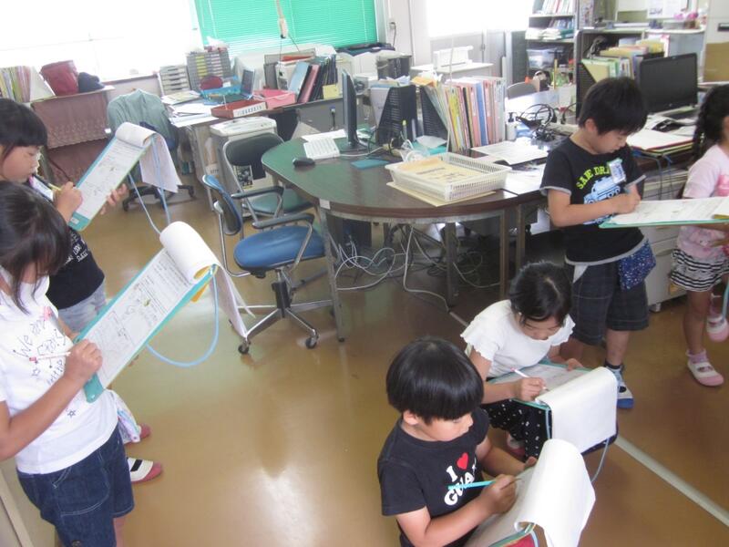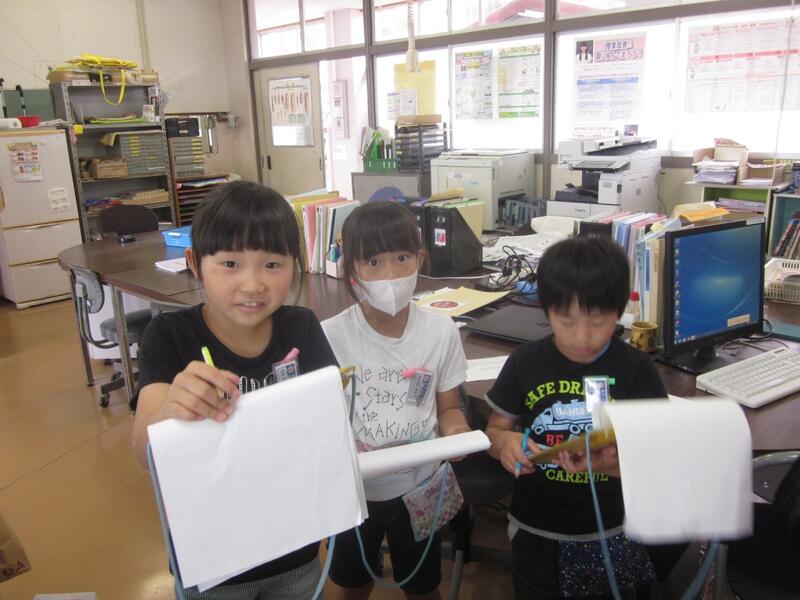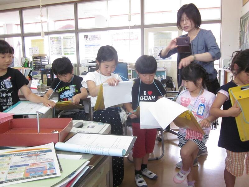 1・2年生が学校探検をしました。職員室に来てたくさん質問したり部屋の中にあるものを見学したりしました。