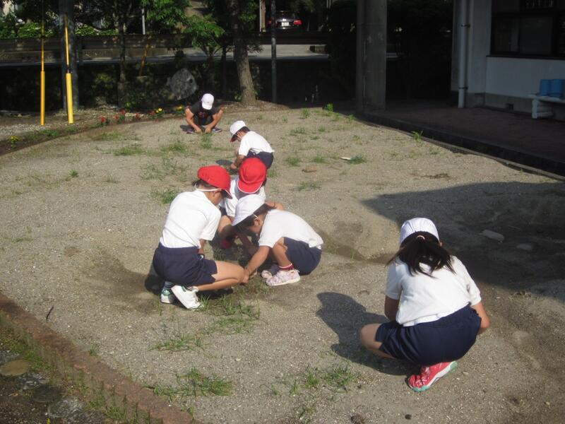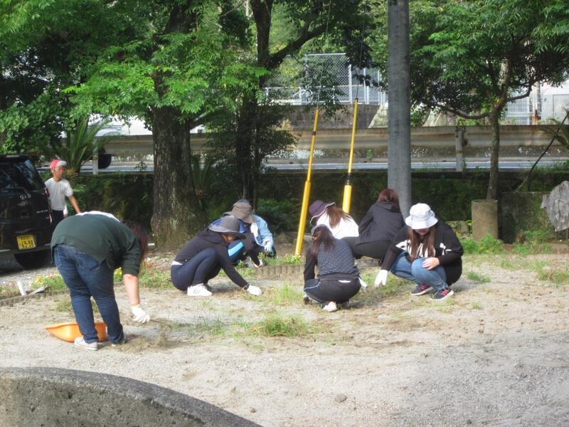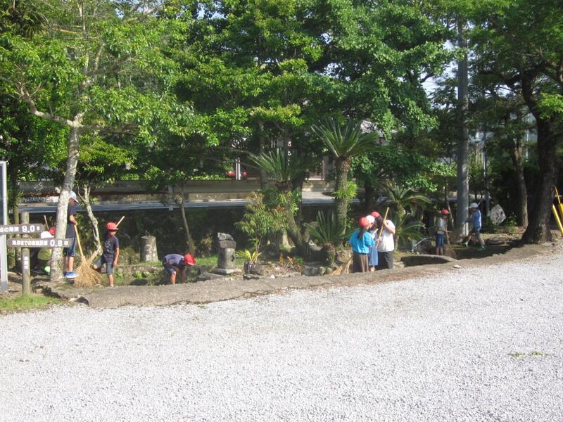 都井小学校では毎週木曜日の朝、全校で校内や学校周辺の道路の花壇の手入れや除草を行っています。雨の日は校内のホールの清掃をしています。