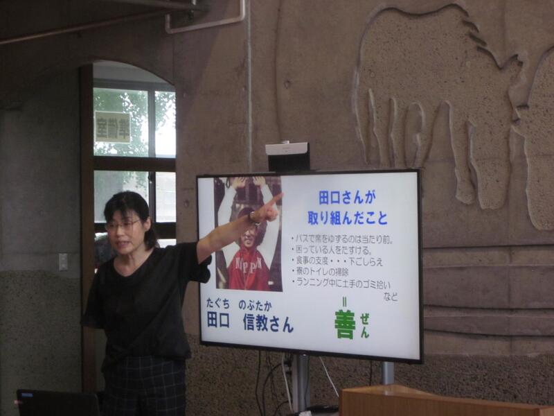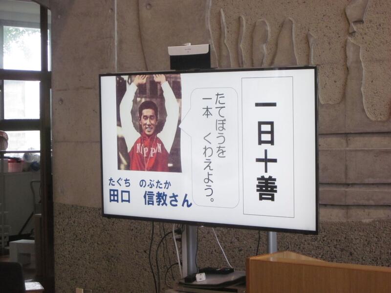 今月の担当の先生からはオリンピック選手の話がありました。田口信教さんという水泳選手が金メダルをとるために水泳だけでなく行いにもみがきをかけていった話です。子どもたちは「一日一善」という言葉を熱心に聞き入っていました。田口さんのように「一日十善」を目指して頑張ってほしいです。