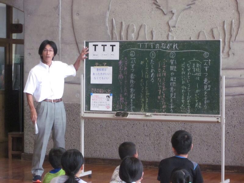 都井っ子トーキングタイム「TTT]集会を開きました。今回のテーマは「登校班があった方がいいか、なくてもよいか」でした。班の中で、あった方がよい理由となくてもよい理由を話し合いながら「登校班の意義」を一人一人考えていました。