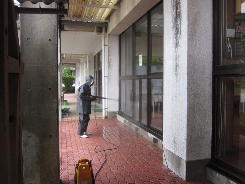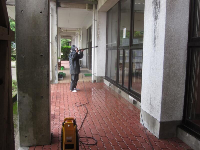 大雨が続き臨時休業になった日、「日頃は授業の邪魔になるからできない。でも今日は」と、雨の中高圧洗浄機で窓ガラスや校舎ベランダ側のコンクリートをきれいに作業していただきました。心から感謝します。