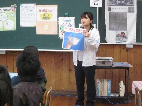 都井小は全校みんなで給食を食べています。全校児童、全職員の誕生日の日にはみんなでお祝いをします。カードを作ってくれているのは5、6年生の委員会の人です。カードをもらった誕生日の人は御礼とこれからの目標などを発表します。