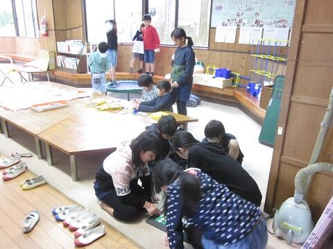 新学期がスタートしてすぐに雨が降りました。外で遊べませんでしたが、全校みんなで室内で工夫して楽しく過ごすことができました。
