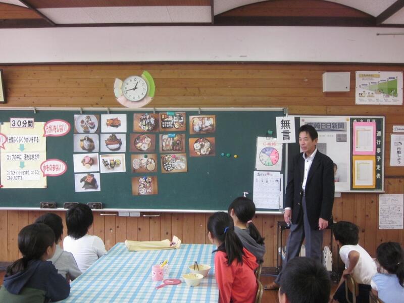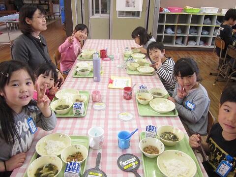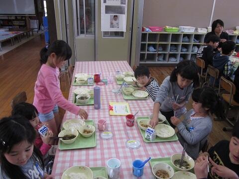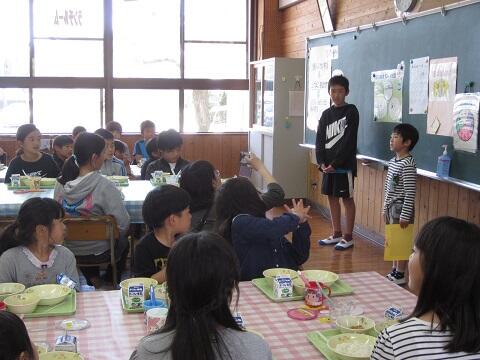 1年生が小学校初めての給食を食べました。2年生がやさしく教えていました。