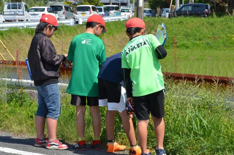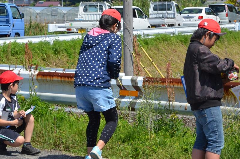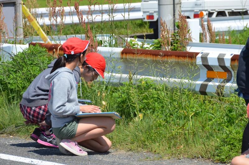 交通安全教室を開きました。警察署や交通安全協会の方々から指導を受けて校内で練習した後、実際の通学路で体験しました。