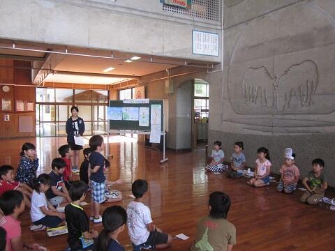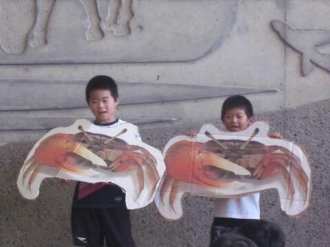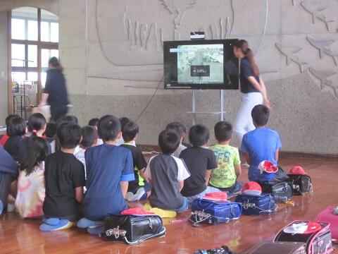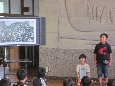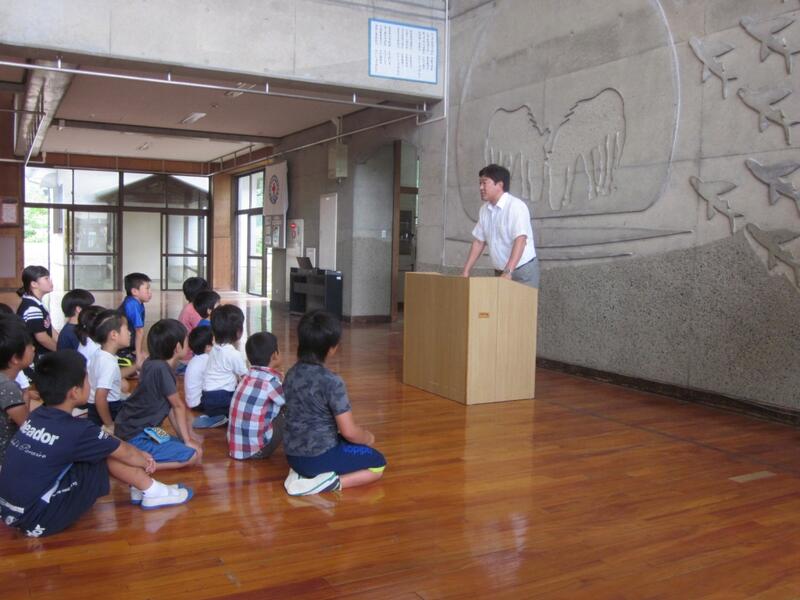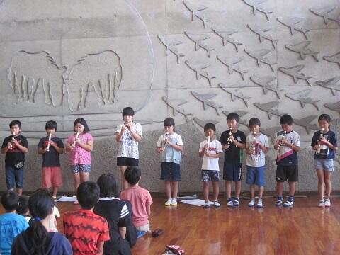 とびうお集会で、3、4年生が本城干潟での学習を道具を使って発表したり、リコーダー演奏をしたりして頑張りました。