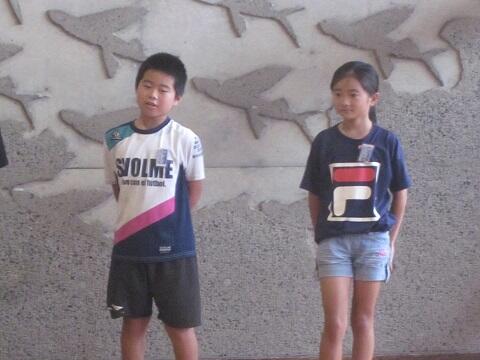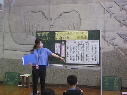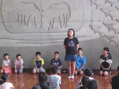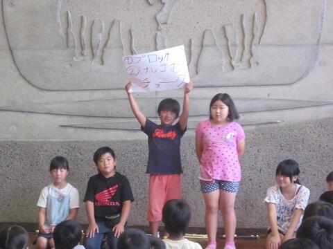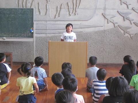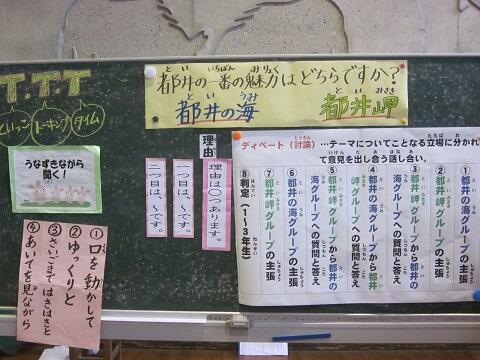 今回のTTT集会のテーマは「都井の一番の魅力はどちらですか。都井の海?都井岬?」でした。4、5、6年生がそれぞれのグループに分かれて「海」「都井岬」のアピールをして、1、2、3年生がどちらの考えに納得したか判定を出す活動でした。