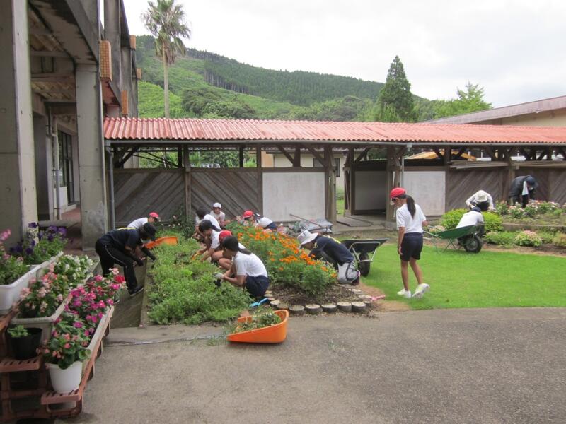 9月6日(木)「JAはまゆう都井支所~みやこ保育園~都井小学校間をコスモス満開にする運動」に1、2年生が参加しました。