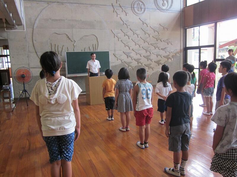 8月29日、今日から2学期のスタートです。長い長い夏休みが終わり、課題をしっかりやり遂げた、すがすがしい顔でみんな登校してきました。始業式では、3人の児童が意見発表をしてくれました。1年のるうかさんは、「さかあがりをがんばる」、3年生のおおすけ君は「運動家でW優勝をする」、5年生のそらさんは「本をたくさん読む」という内容でした。