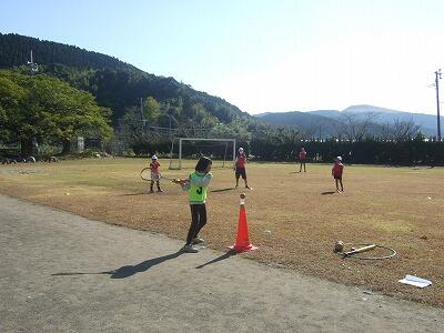 今日は体育でTボールをしました。3年生から6年生で4チームに分かれて対戦しました。バットで打ったり、ラケットで打ったりして楽しくゲームできました。