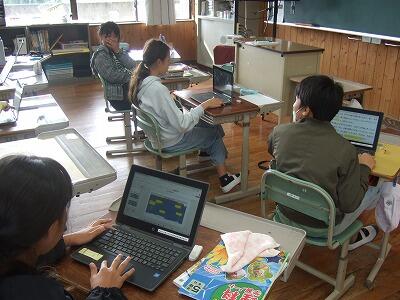 3・4年生は社会科で調べ物をしていました。串間市に関係のあるトビウオやお祭りや行事などをタブレットを使って調べていました。