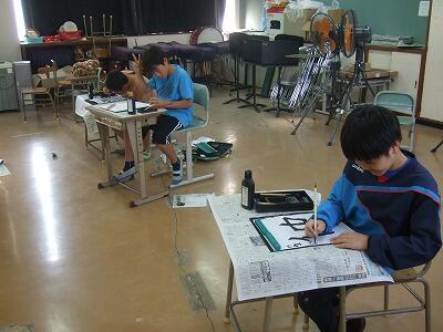 34年生は習字。条幅紙に書いていました。4年生は「美しい空」都井の空を思い浮かべて上手に書いていました。