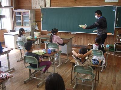 1・2年生に、金丸先生から、配膳をする人がお盆に食器を置きやすいように考えて並んでくださいね、とお話があっているところでした。また、子どもたちは食べる前の挨拶で「たくさんの命に感謝して、いただきます」と言って食べます。給食時間も、いろんな大事なことを学んでいます。モリモリ食べて大きくなってね。