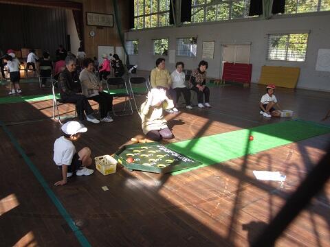 「都井地区青少年育成協議会事業~異世代間交流ふれあいスポーツ大会~」の競技の様子です。下学年は体育館で「サロン競技」に取り組みました。上学年は運動場で「グランドゴルフ」に取り組みました。
