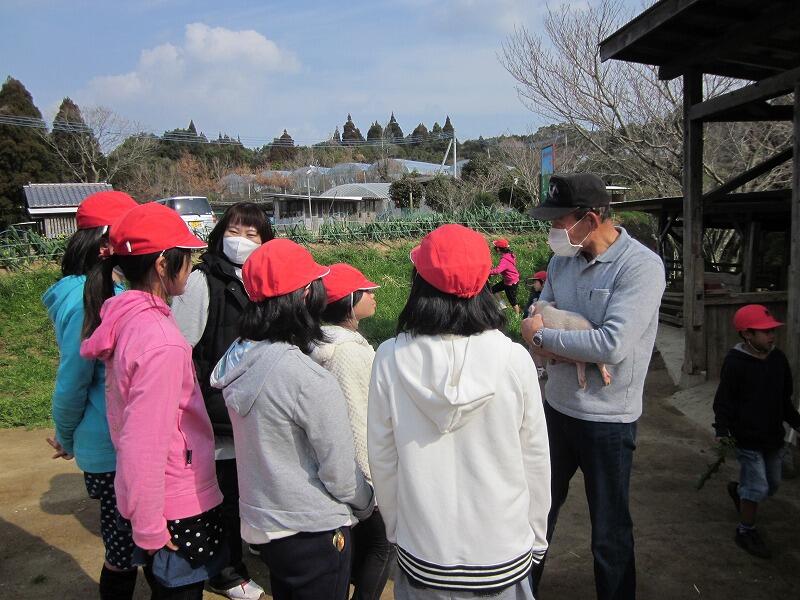 3月12日(木)、1~2年生及び5年生(18名)が本城にある「おにつか園」に午前中、訪問をしました。特に1年生は、2週間ほどおにつか園のウサギやモルモットを学校で飼っていたので気持ちの高ぶりがMAXでした。
