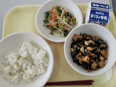 麦ごはん、炒り鶏、うみっこ節サラダ、牛乳