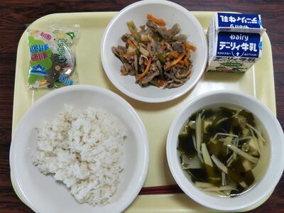 麦ごはん、牛肉とごぼうのきんぴら、春雨の中華サラダ、牛乳