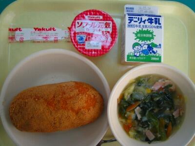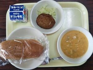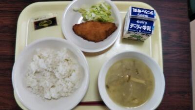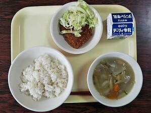 麦ごはん、米粉のだご汁、かぼちゃコロッケ、キャベツ、牛乳