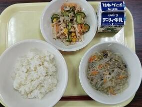 白ごはん(日南産早期米)、春雨スープ、ヤンニョムチキン、キャベツ、牛乳