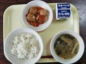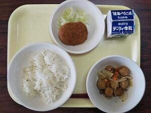 麦ごはん、肉団子の甘酢あんかけ、さつまいもコロッケ、キャベツ、牛乳
