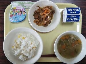 麦ごはん、中華コーンスープ、チンジャオロースー、国産ももゼリー、牛乳
