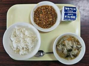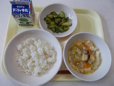 麦ごはん、八宝豆腐、たたききゅうり、牛乳
