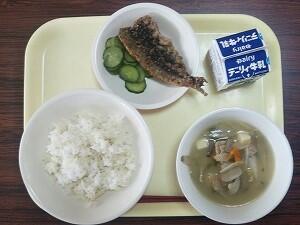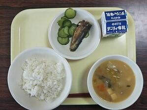 麦ごはん、豚汁、いわしのかば焼き、きゅうり、牛乳